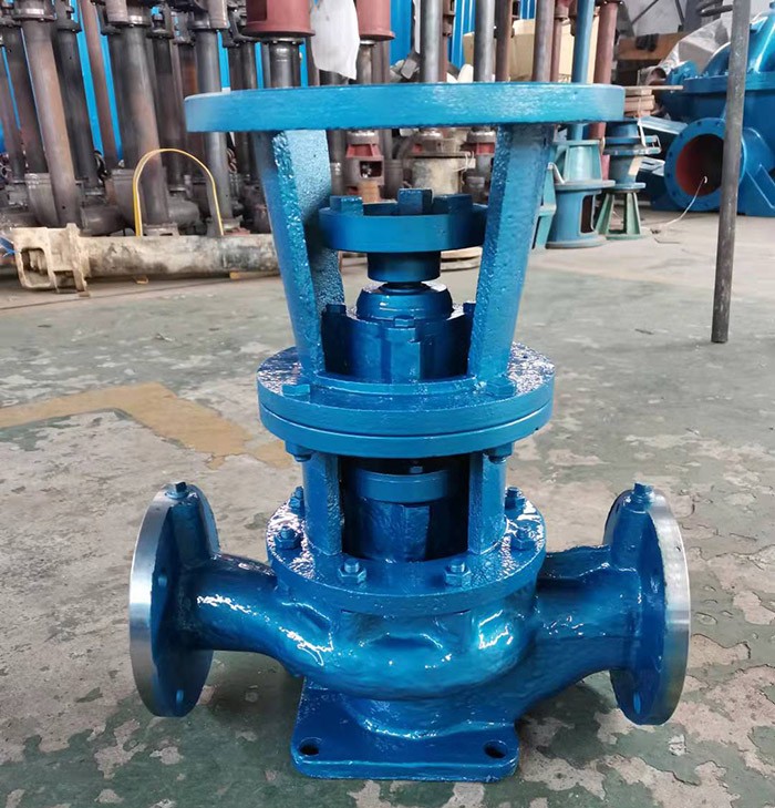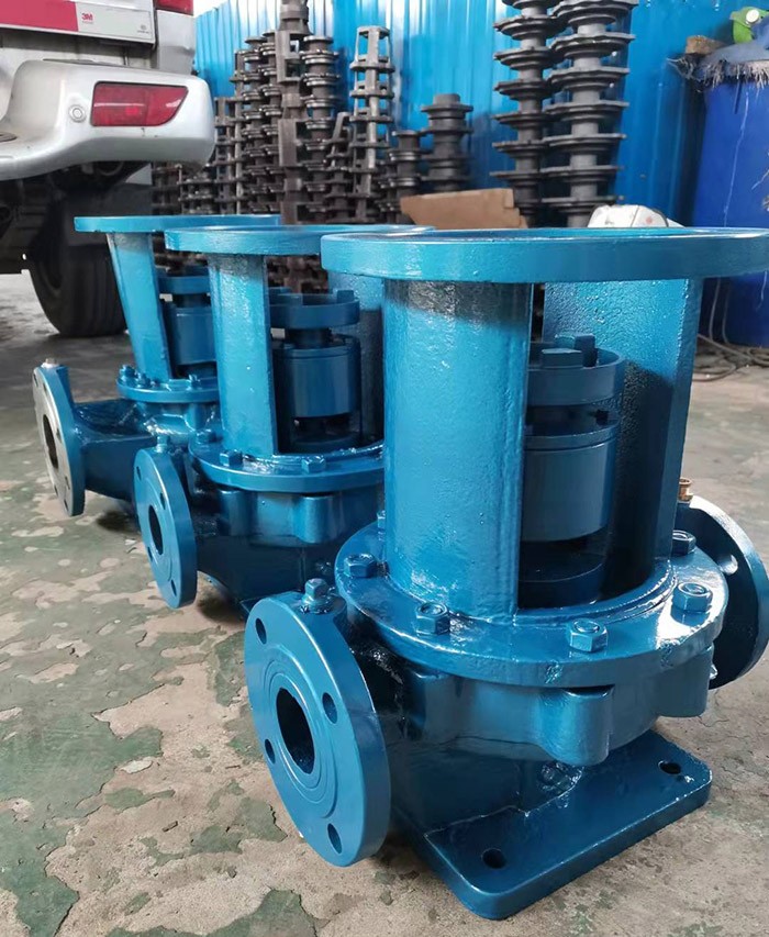 分體式管道泵,包括泵體,葉輪,泵軸,電機,機封,軸承,電機由連接法蘭與泵體固定連接,連接法蘭與泵體密封連接,在泵軸與連接法蘭之間安裝機封和軸承,泵軸的下端通過葉帽與葉輪固定連接,主要是泵軸上端固定安裝聯軸器,該聯軸器為圓柱體結構,圓柱體的下端面與泵軸上端固定連接,圓柱體中心制有與電機軸動配合的圓孔,圓柱體圓孔內壁沿圓柱體中心線方向設有平鍵,該平鍵與電機軸端部的鍵槽相互配合.通過聯軸器與電機軸插裝式連接,使泵與電機可以互換配套,用戶可以獨立購買泵和電機進行配套使用,具有使用方便,維護成本低等優點。